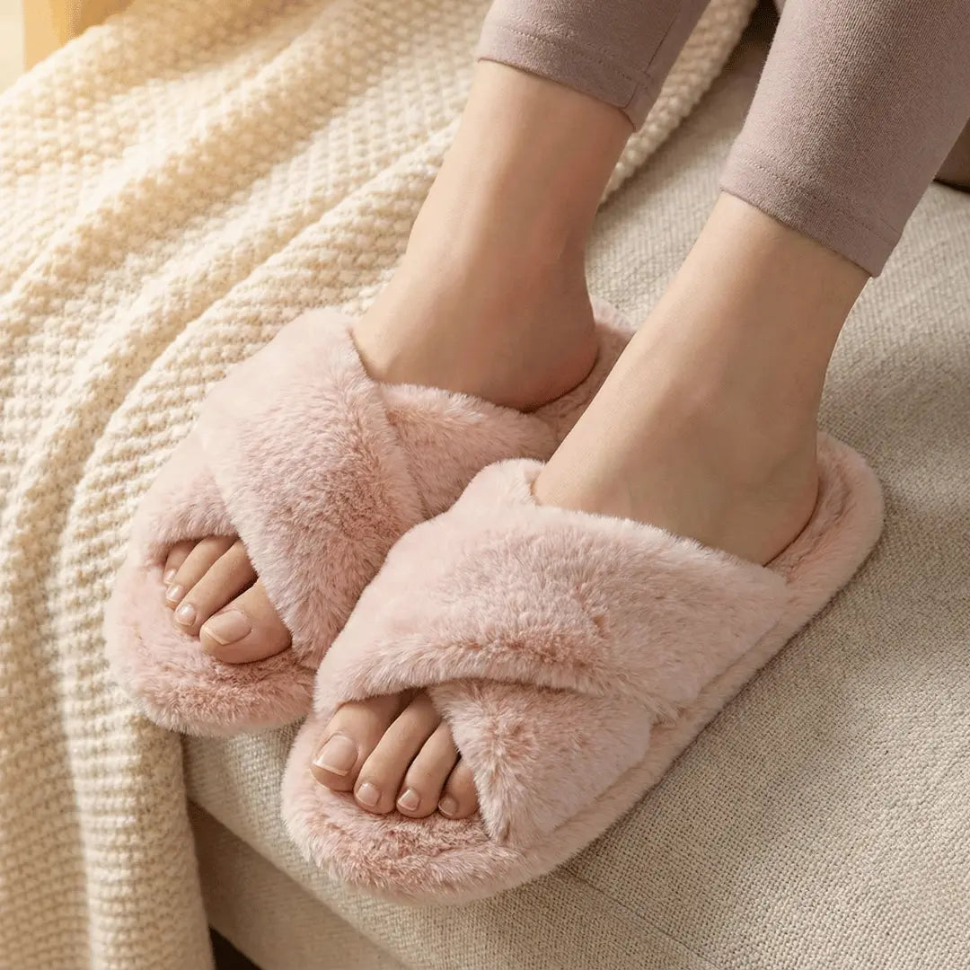 Wrap your feet in luxurious comfort with the NOLA Cozy Cross Slippers. Their modern cross-band...