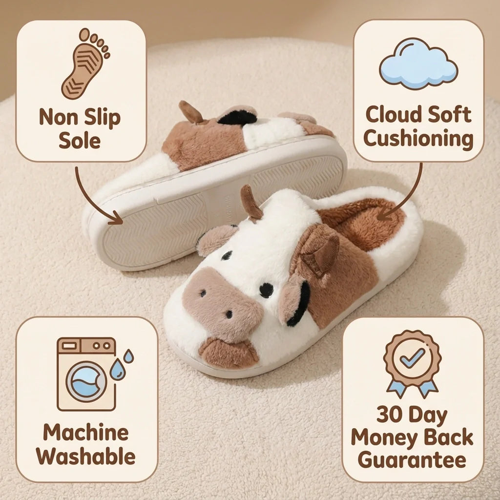 With an ultra-soft plush exterior and an adorable cow design, these slippers combine playful style with everyday comfort.