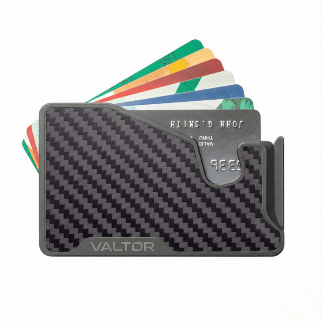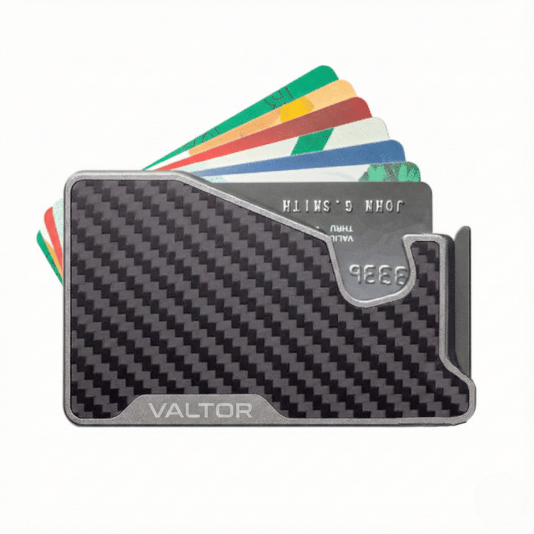 VALTOR – Carbon Card Holder is an ultra-slim metal wallet with a carbon fiber finish, designed for fast access and everyday security. The smooth eject mechanism releases cards with a single push, while the durable aluminum body protects against bending and wear—perfect for a modern, minimalist lifestyle.